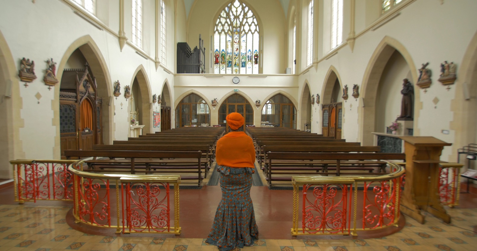 Two short films breath further life into When the Sky Falls Larry, The Expulsion, 2019 and Sunday’s Best, a short film which addresses the belief systems within the African diaspora and the influence of colonial histories, traditional seating is replaced by church pews and an PAN-AFRICAN FLAG FOR THE RELIC TRAVELLERS’ ALLIANCE, featuring a symbolic colour palette and 54 stars for the 54 African countries.
