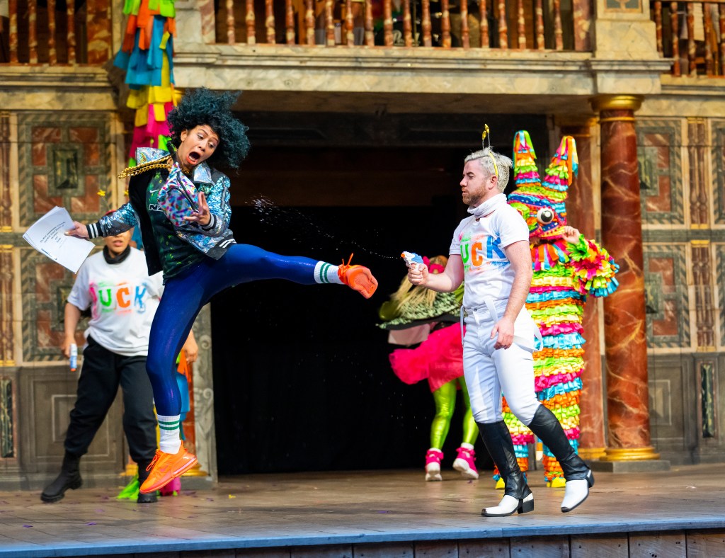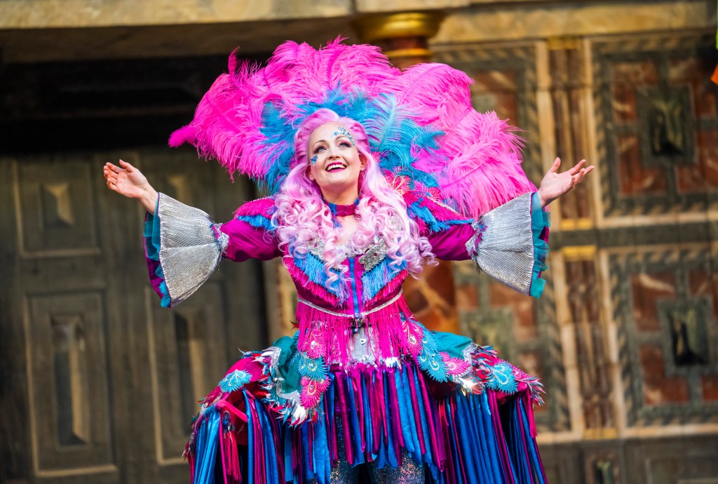 Shakespeare’s Globe opens with Sean Holmes’s A Midsummer Night’s Dream one of theatre’s first press nights, a bright and bold “Mardi Gras” style production with a socially distanced audience. A wonderful place to return to the theatre, the Globe has its own magic as night falls and the stage is lit up by the actors in their multi-coloured costumes, sparkles glitter. pointed hats for the fairies, sequins, the backdrop is a simple set decorated with bright coloured “banners” which looks like a large wide string made out of hundreds of different coloured pompoms. (Main image: Shona as Helena credit ©Tristram Kenton)