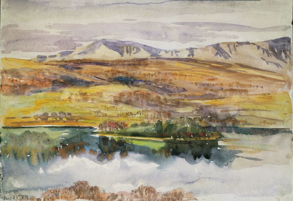 Drawing View across Esthwaite Water; Drawing; watercolour over pencil view across Esthwaite Water by Beatrix Potter, November 21st 1909; Linder Bequest cat. no. LB.542. Beatrix Potter (1866-1943) Esthwaite Water 21st November 1909 Watercolour over pencil on paper