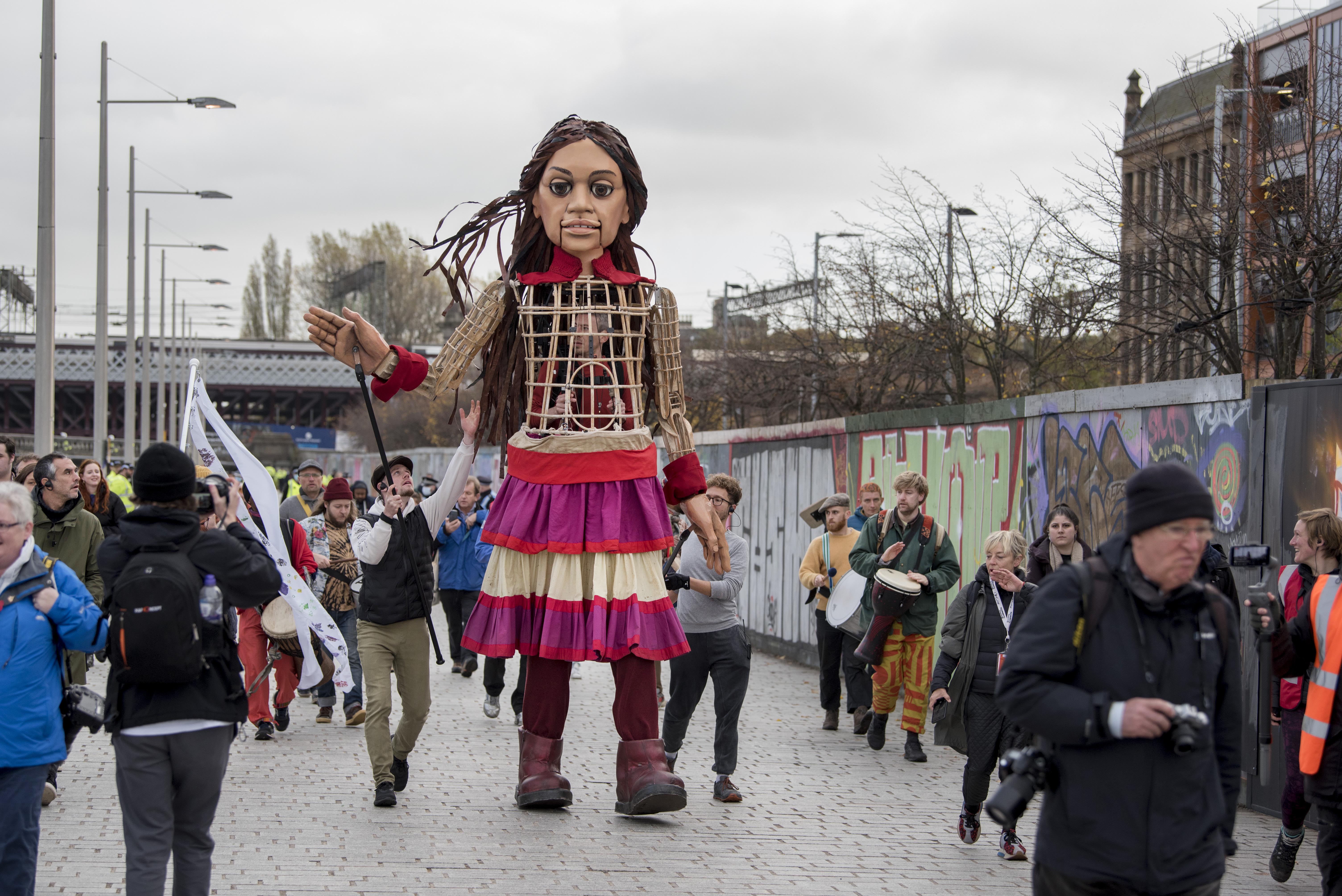 It takes three puppeteers to operate Little Amal: a stilt walker whose legs become Amal’s and who also animates her face, and two other puppeteers, one operating each of her arms. There is a team of ten puppeteers, some from refugee backgrounds. The puppet is crafted from moulded cane and carbon fibre.