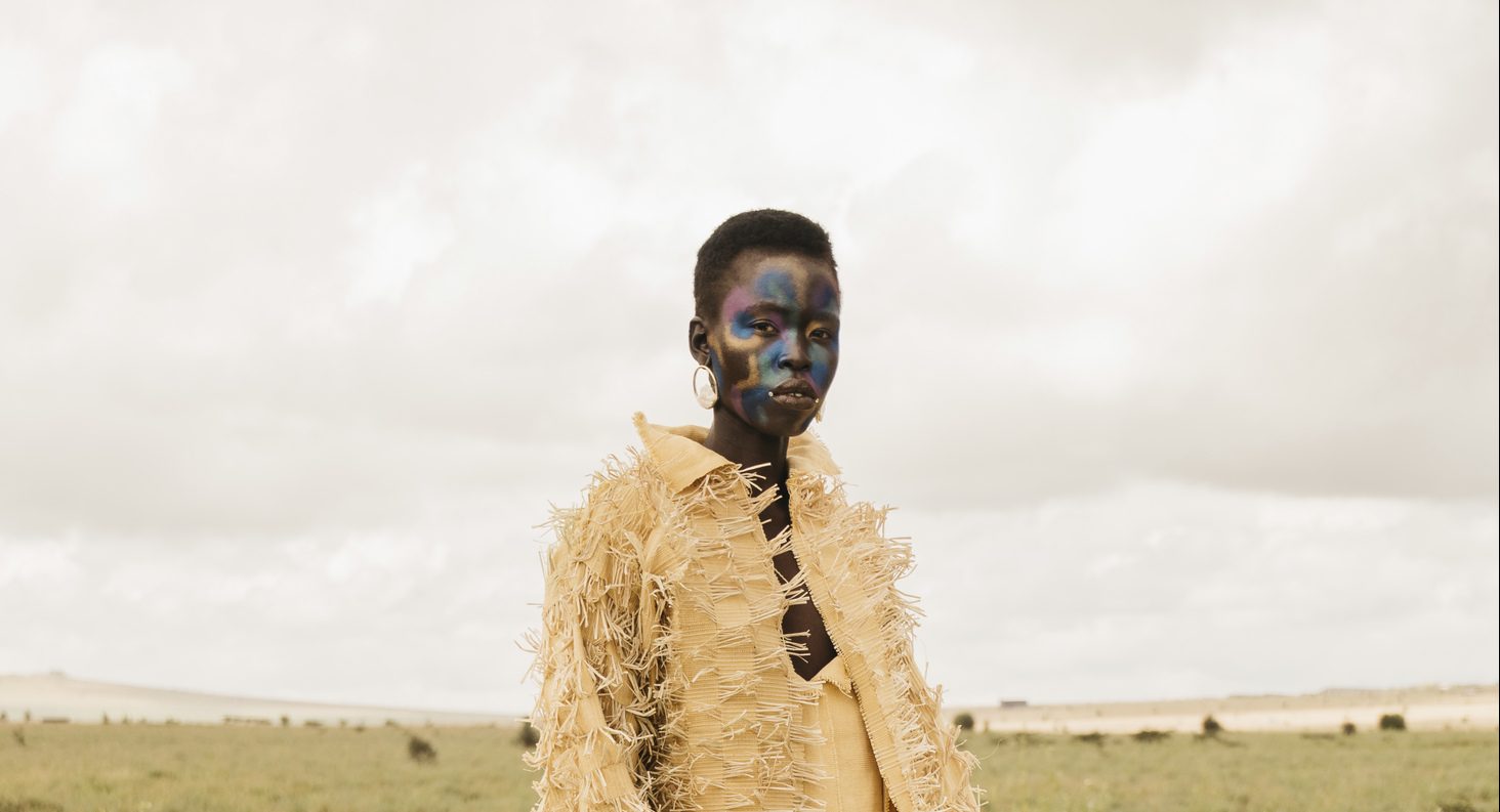 Afrotopia features a look from Thebe Magugu’s Alchemy Collection that centres on African spirituality and the relationship we have with our ancestors. The designer collaborated with Noentla Khumalo, a stylist and traditional healer, on the collection. Alongside is a look by Selly Raby Kane, which takes inspiration from Afro-Futurism.