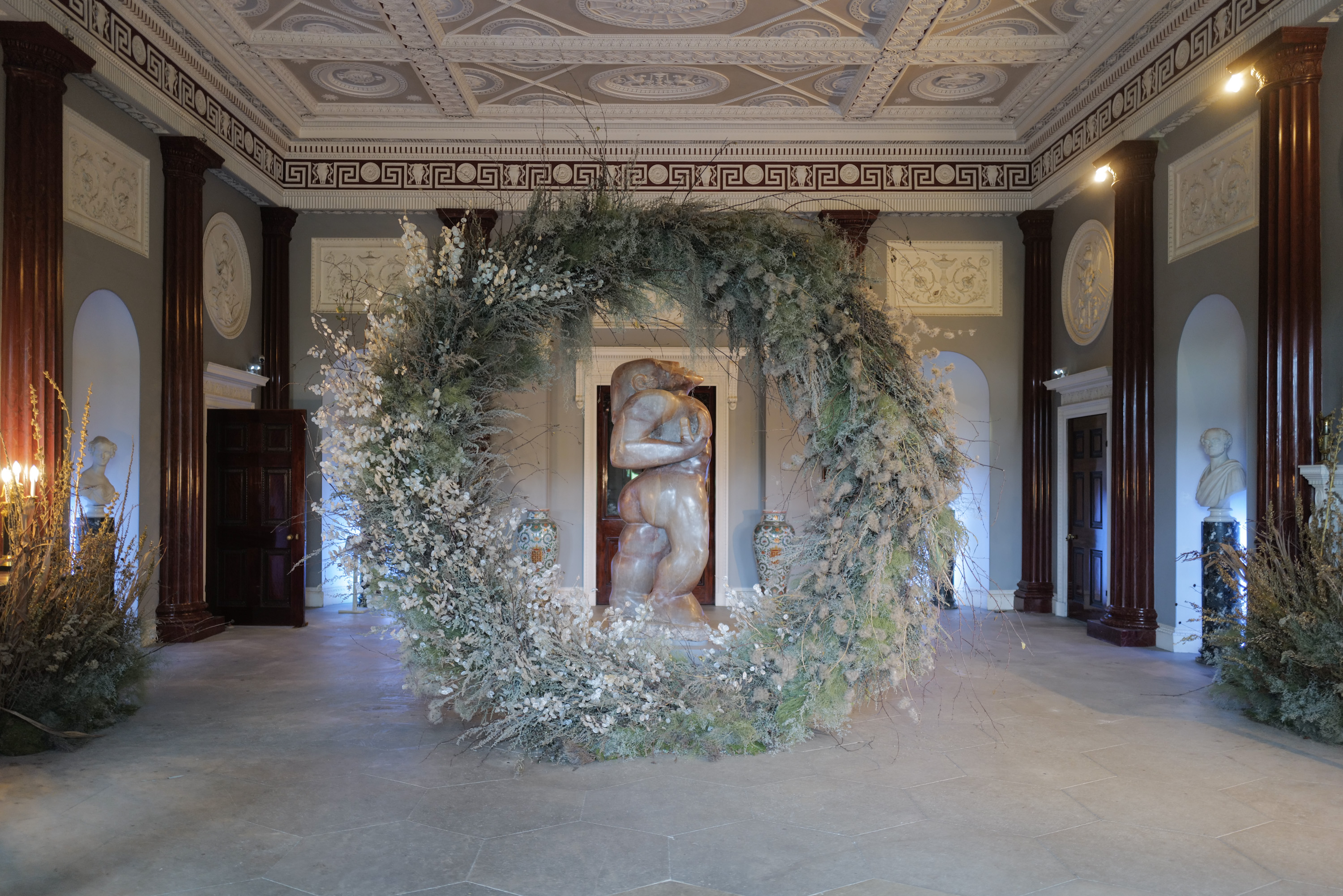 The Yellow Drawing Room has been transformed by Matt Galvin of Galvin Brothers who has produced a playful, interactive seating installation using specially created vase elements which display winter florals and spruce. A touch of West Indian Carnival comes to the exhibition with a large-scale Christmas tree inspired by many different winter festivals and celebrations by Carnival costume designer Hughbon Condor in the State Dining Room.