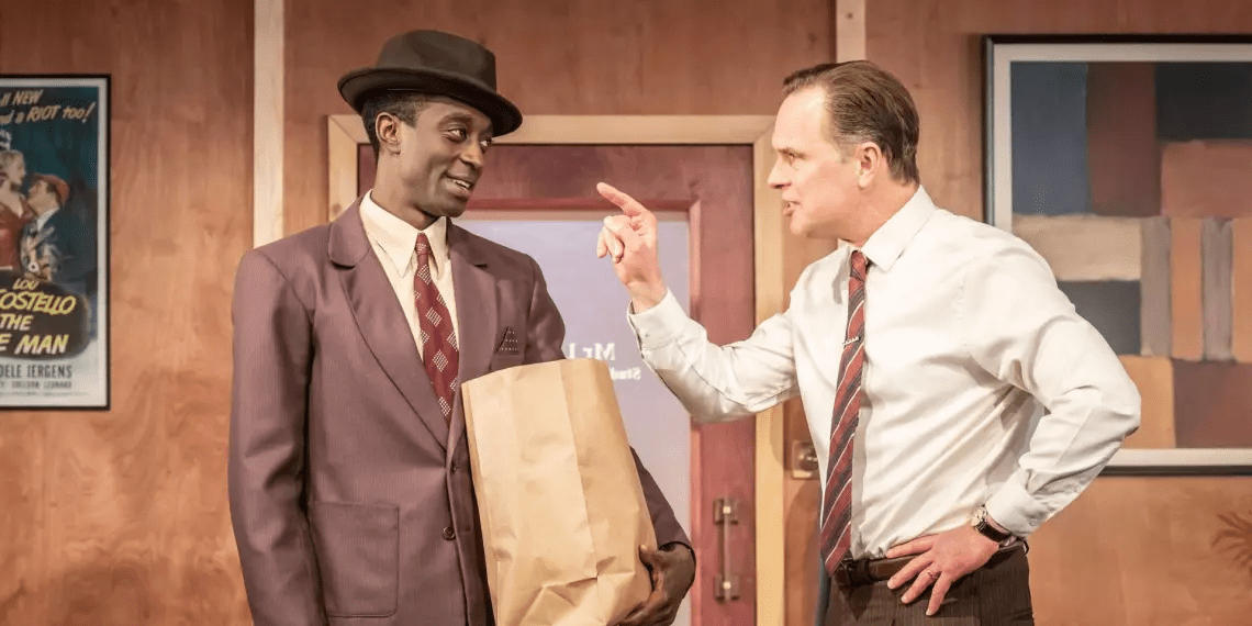 The three hander takes place in the NBC New York office in 1954. Sidney then is an aspiring actor, NBC offer a lucrative contract to play the lead in their network film drama, A Man Is Ten Feet Tall. For Poitier this could be a deal breaker taking his career to new heights. But it is not quite as straight forward for Sidney as his meeting with Bobby (Ian Bonar) the aspiring writer and well meaning “white friend” and bully NBC lawyer Larry Parks (Daniel Lapaine) in the smoked filled office comes with conditions attached fuelled by NBC paranoia of the Civil Rights Movement, bolstered by the FBI and McCarthyite politicians being convinced the movement is part of a communist plot and at the helm of the plot is Paul Robson. Poitier must sign a contract that denounces Robson publicly. Before his arrival in the office Bobby sets the tone of the time by reminding us that Sidney is not “Belafonte black” but “Black-Black” this is said in earnest as Bobby wants his friend to get the part.
