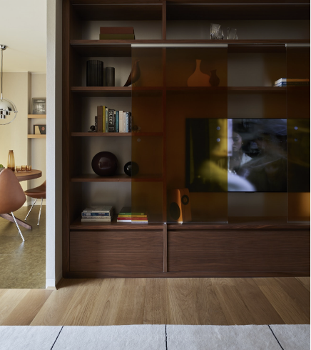Responding to the brief, the new design is intended for a couple who recently retired and wanted a retreat within the romantic surroundings of their favourite brutalist inner city. In her approach, Olga employed a minimalist touch, maintaining the 20th century character of the apartment interiors which was frozen in time with pink fabric walls and bright pops of green paint, whilst reviving the space with contemporary interventions and mod-cons.