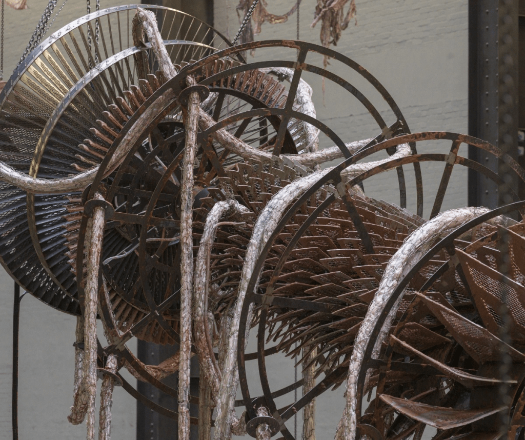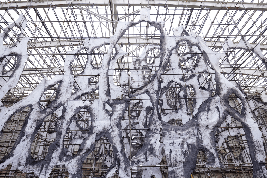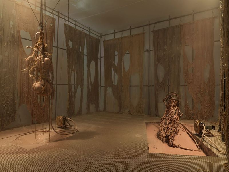 The new work also looks towards the duality of regeneration and decay. Slowly spinning, the industrial turbine assumes surprisingly human qualities, pumping dark pink viscous liquid through dangling vein-like silicone tubes, collecting in a large sloping tray underneath. Here, fabric sculptures made from construction mesh and bent steel rebar hang, absorbing the liquid to form new ‘skin’ sculptures. These are carried by technicians to drying racks, a process that feels both artisanal and suggestive of an industrial production line. Once dry, the skins are hoisted onto the chains suspended from the ceiling, redolent of the pulley systems used in coal miner’s changing rooms to dry uniforms and keep clothing clean, a liminal space between their labour and personal lives. Suggestive of anatomy, the skins speak of vulnerability, the necessity of care and human touch, and the production of new bodies and identities. Throughout the commission’s run, the number of new hanging skins will increase, creating a sense of the building ‘shedding’ increasingly over time.