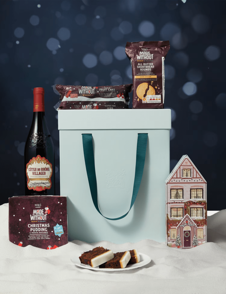 Gluten-Free gift box means that everyone can enjoy the Christmas classics. M&S filled this stylish gift box with a delicious selection of treats to enjoy, from Cotes Du Rhone Villages wine to a Christmas Dark chocolate and orange cookie tin, an Iced fruit cake bar, a Six Month Matured Christmas Pudding, and a pack of stem ginger snaps, all of which are Gluten-Free.Gift Contents