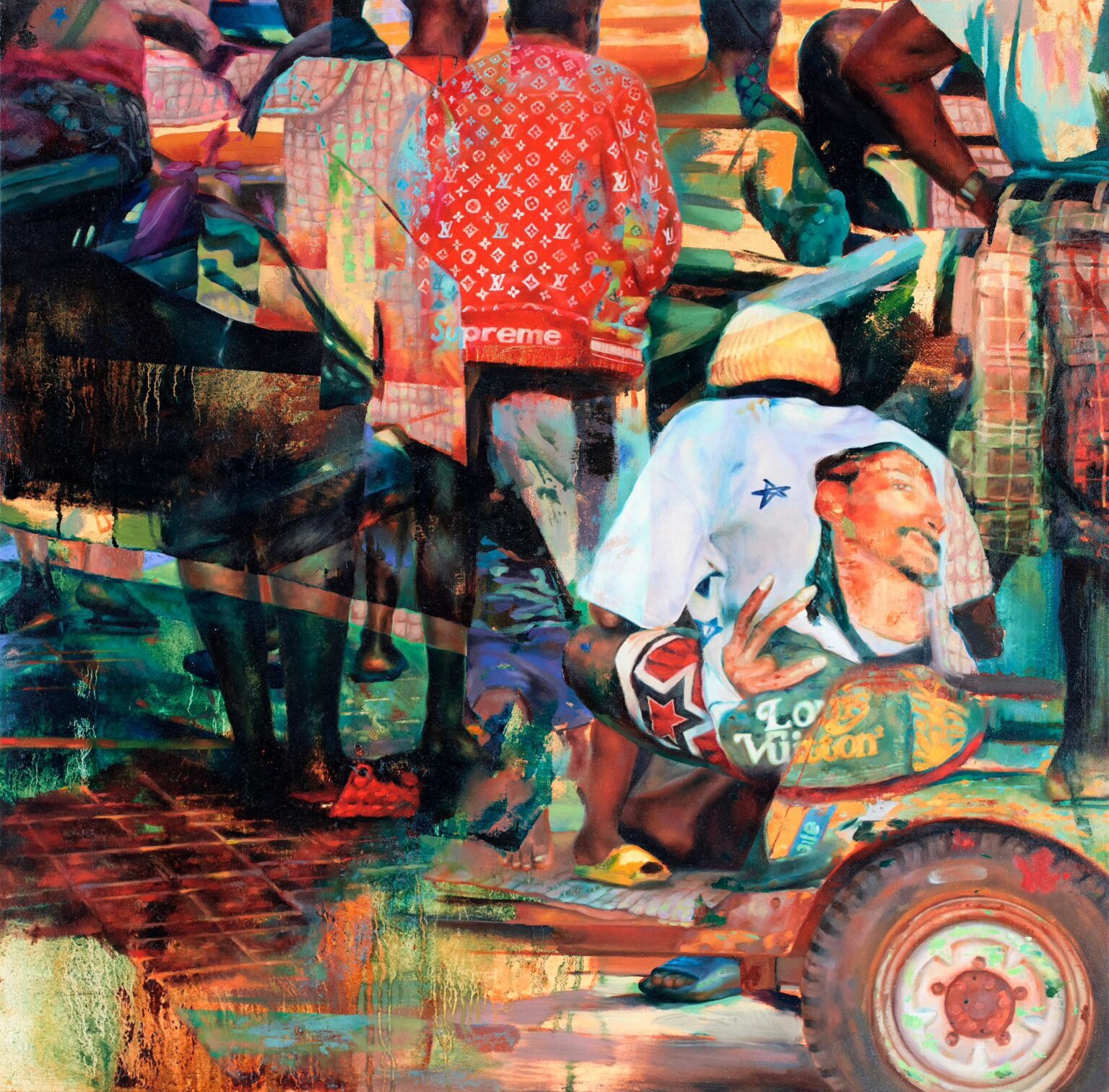 The “I Am Because We Are” collection reveals a series of figurative paintings created by Herring during her artist residency with Arms Around the Child, a charity dedicated to providing safe homes, education, and support for children in need across the globe. The AATC artist residency offered Herring a unique opportunity to travel to Ghana, where she immersed herself in the charity’s mission and explored the country’s energetic culture, rooted in tradition and full of personality. She was also given the chance to engage with the country’s thriving and emerging global art scene, which deeply influenced her creative process.