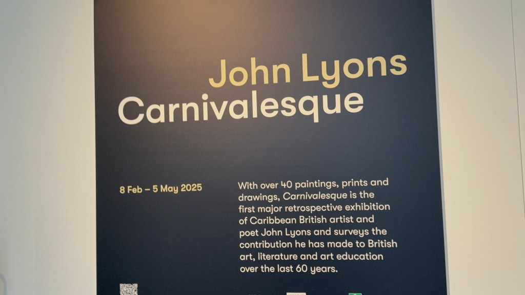 Lyons’ Carnivalesque, is now at The Box Plymouth, showcasing his ongoing exploration of Trinidadian Carnival and the cultural energy it embodies. The exhibition is a dynamic fusion of painting and poetry, with his works displayed alongside poems written on the walls. This immersive experience invites viewers to engage with the spirit of Carnival, highlighting Lyons’ ability to merge visual and literary art to explore Caribbean identity, performance, and celebration.