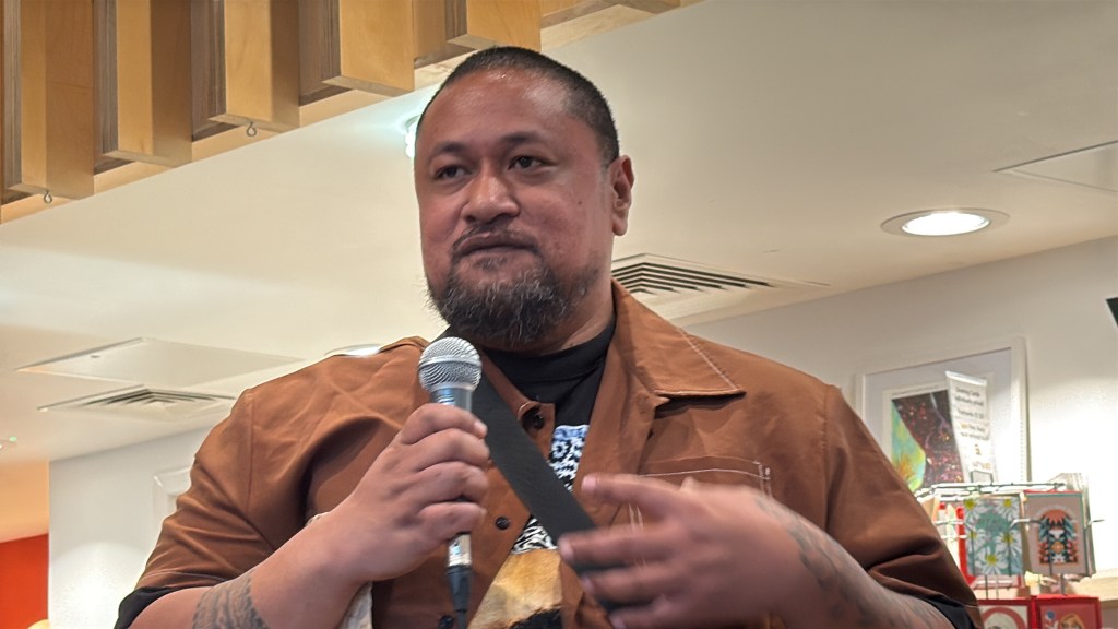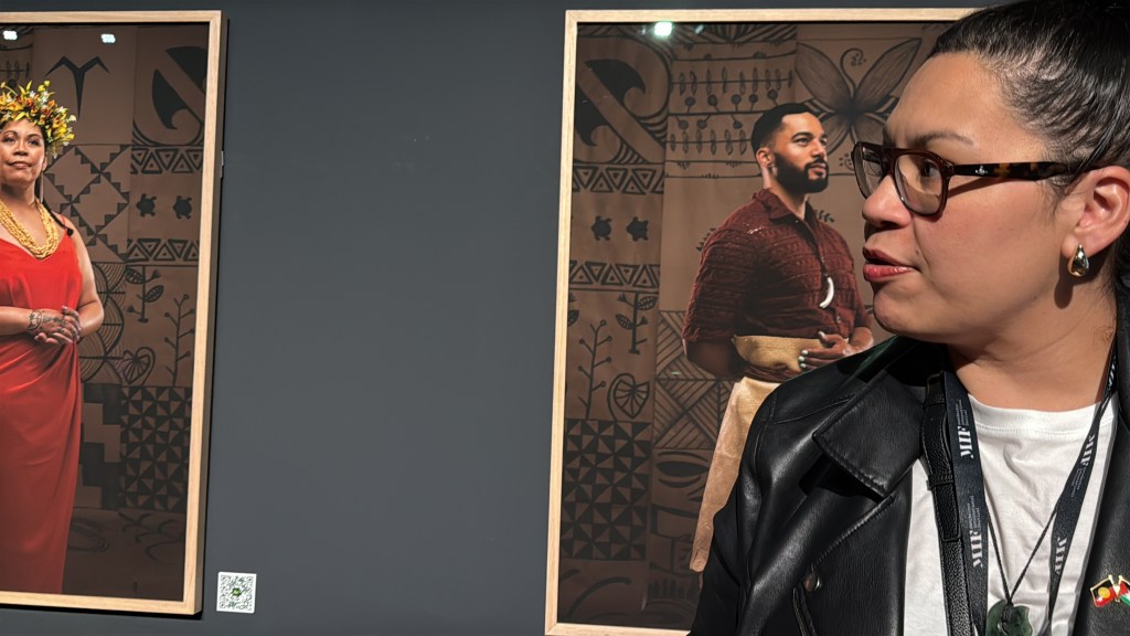 “This was a collective work that we made all together,” Elyssia explains. “The designs in the background are drawn from different Tapa cloth traditions across the Pacific. Where I’m from — Niue — we call it Heapo. These motifs represent the diverse places we come from, including Māori members of the collective.”