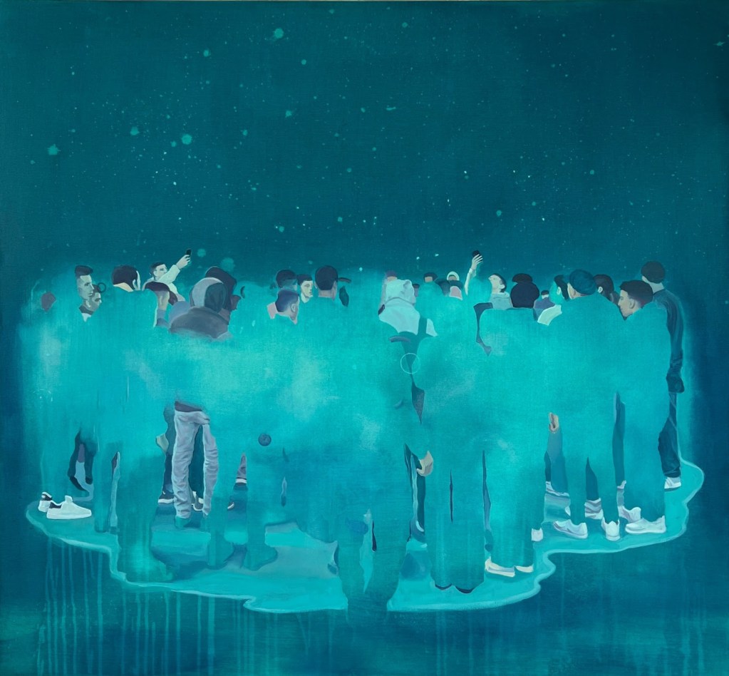 In this new body of work, the artist explores resonance as an intimate and existential experience. Drawing on his in-between cultural existence between Morocco and Germany, Nabil El Makhloufi transforms figurative language into a highly subtle painting practice, oscillating between figuration and abstraction. His suspended crowds, unfinished fragments, and evocations of water reflect humanity’s quest for meaning, revealing fragility and depth, silence and tension.