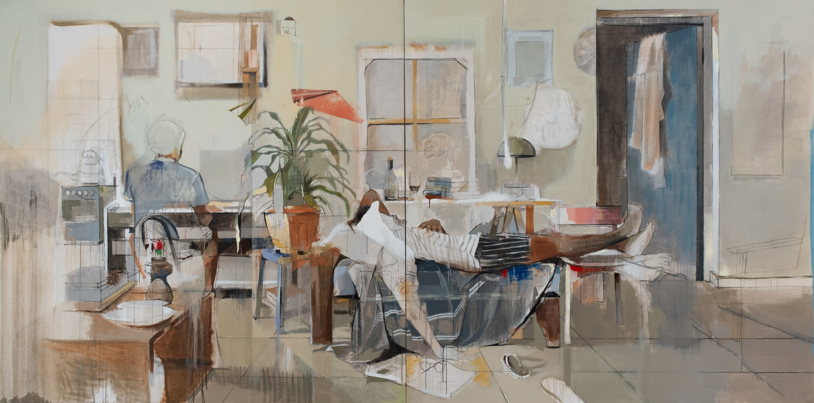 “The result is a painting that resists stillness. These works do not document a moment; they register duration. The room is not fixed. It adjusts, shifts, absorbs emotional residue. Figures appear anchored yet slightly unsettled, as though existing across more than one temporal plane. What is seen is both present and remembered.”