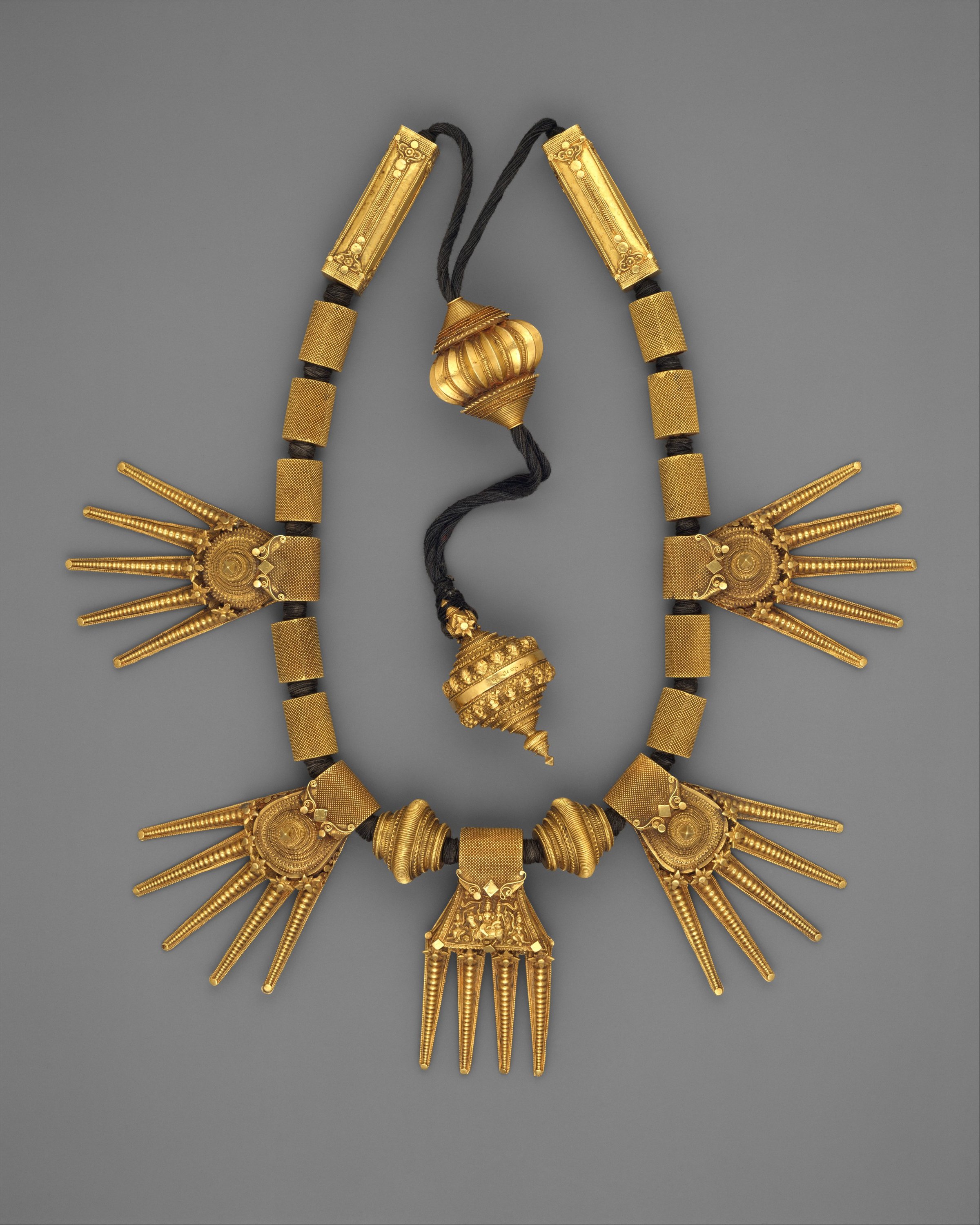 - Necklaces: The exhibition presents a group of exceptional necklaces, ranging from elegant classical works made of precious materials to striking artistic creations. The gold marriage necklace from late 19th-century India depicts Hindu deities Shiva and Parvati as a couple, signifying divine blessing on their union. Another highlight is the opulent necklace of diamonds and pearls (about 1905) by the American jeweller Dreicer & Co., who brought the luxurious style of 18th-century European court jewellery to the Gilded Age elite. Not to be missed are avant-garde works such as the famous American sculptor Alexander Calder’s necklace (The Jealous Husband) (1940), which demonstrates Calder’s playful and artistic approach to jewellery-making.