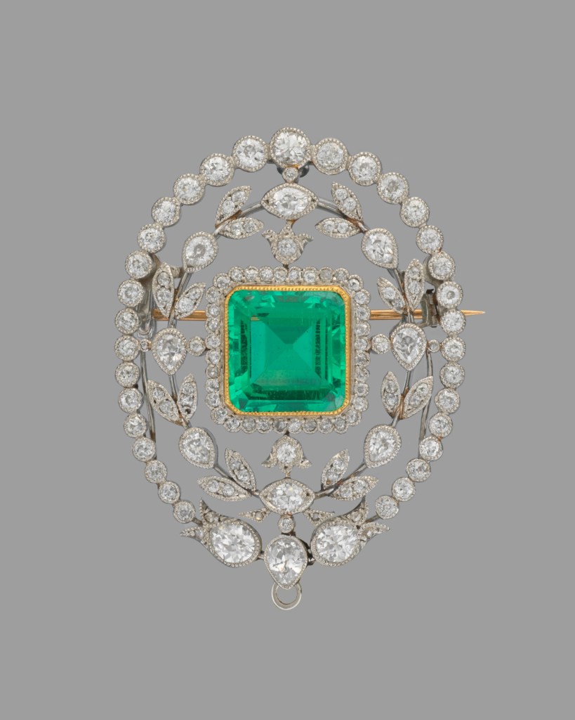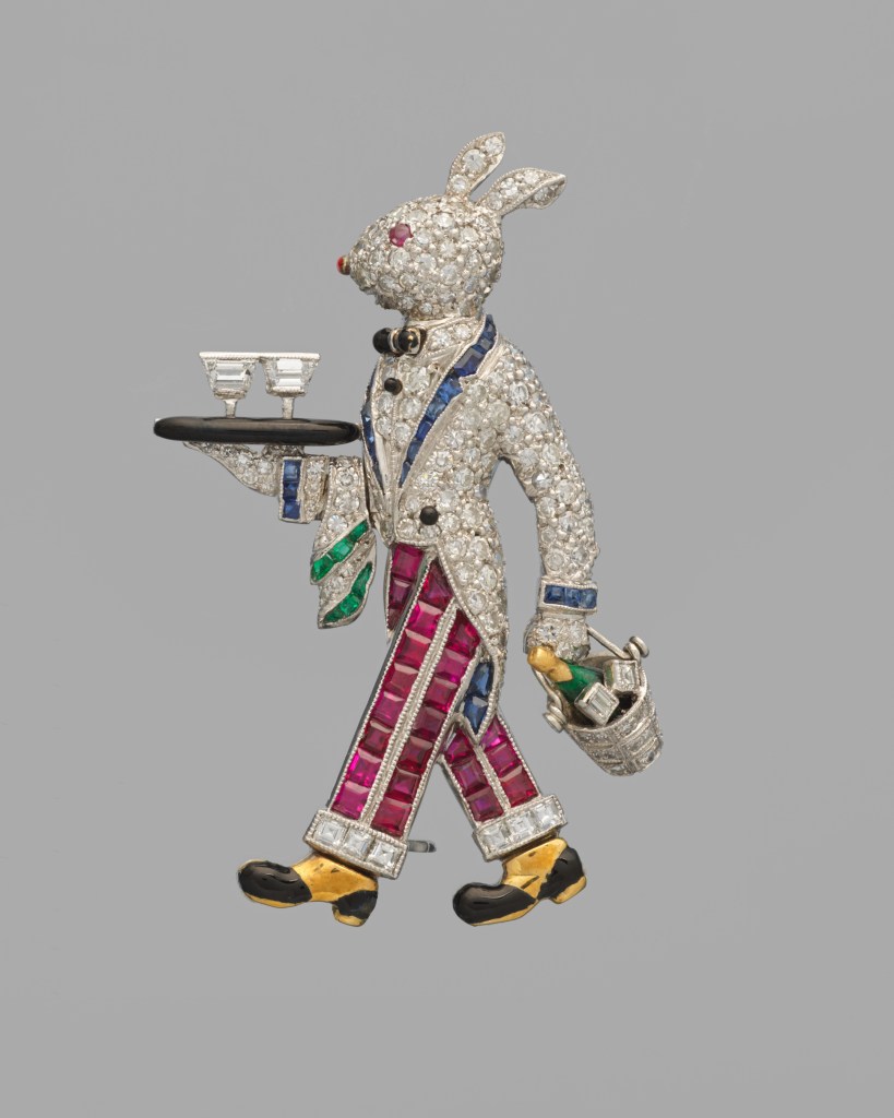 - Pins and brooches: The emerald-and-diamond brooch (about 1900), likely crafted by the New York fine jewellery brand Tiffany & Co., features a large, square emerald framed by pear-shaped brilliant-cut diamonds; the gemstones were set in platinum, a newly accessible material at the turn of the 20th century. Raymond C. Yard, one of New York’s finest jewellers, created the whimsical rabbit brooch (about 1930) in the form of a dapper bunny as a waiter balancing a cocktail tray.